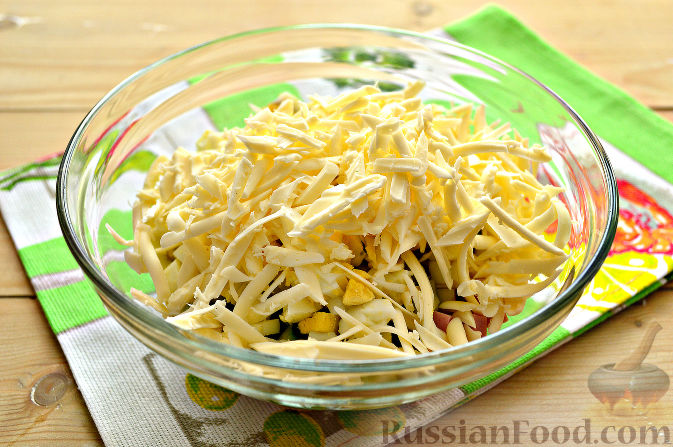 Остывшие вареные яйца очистим от скорлупы и нарежем аналогично колбасе и огурцам.