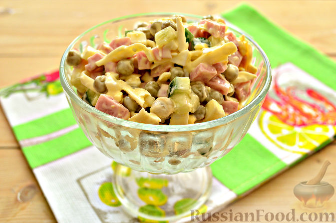 Консервированный горошек — завершающий компонент салата «Нежность». Сливаем жидкость, откидывая горошек на дуршлаг, переправляем горошек в салатник.